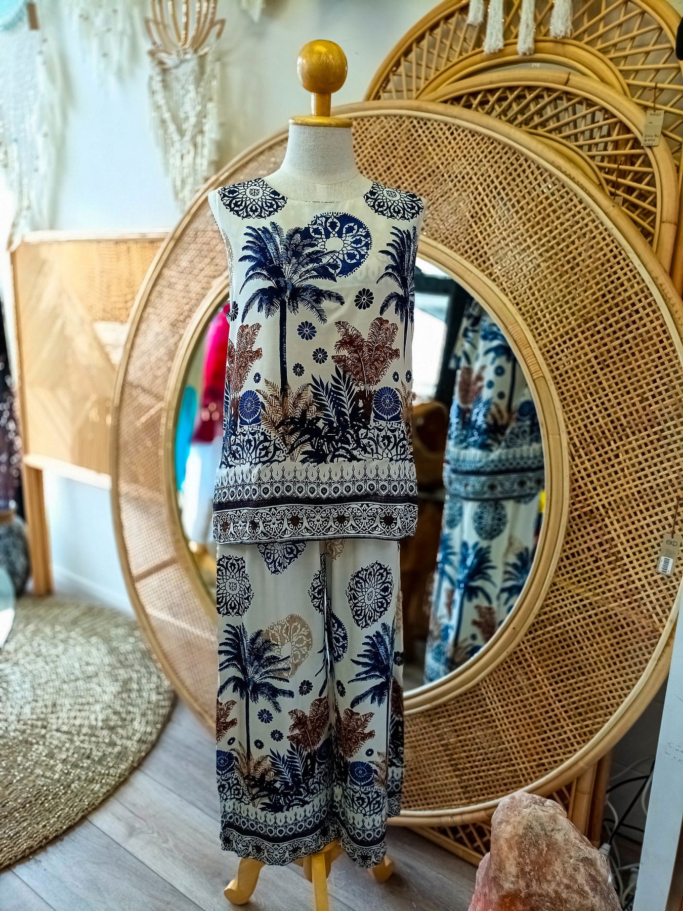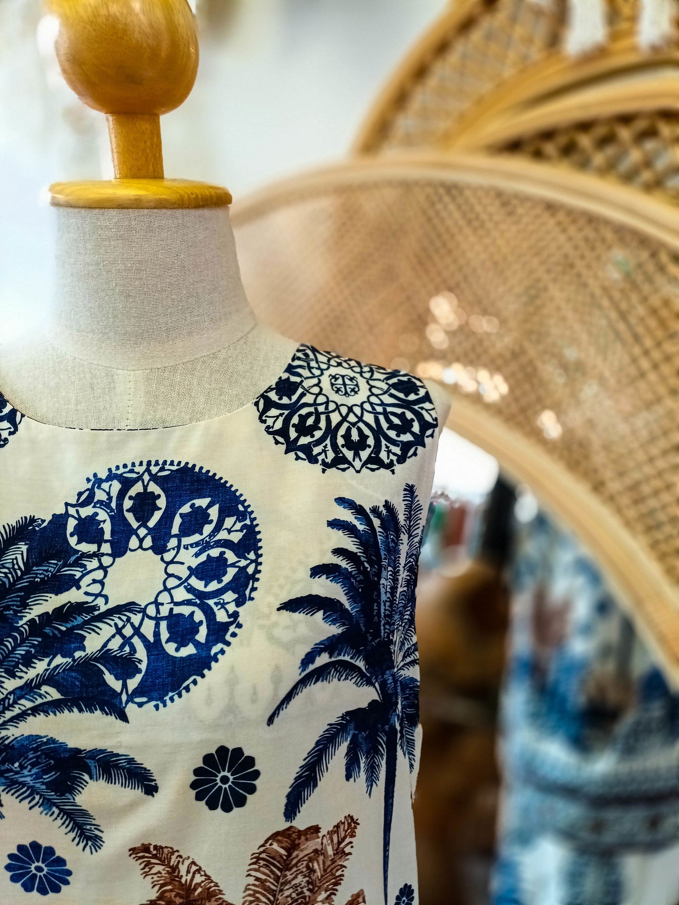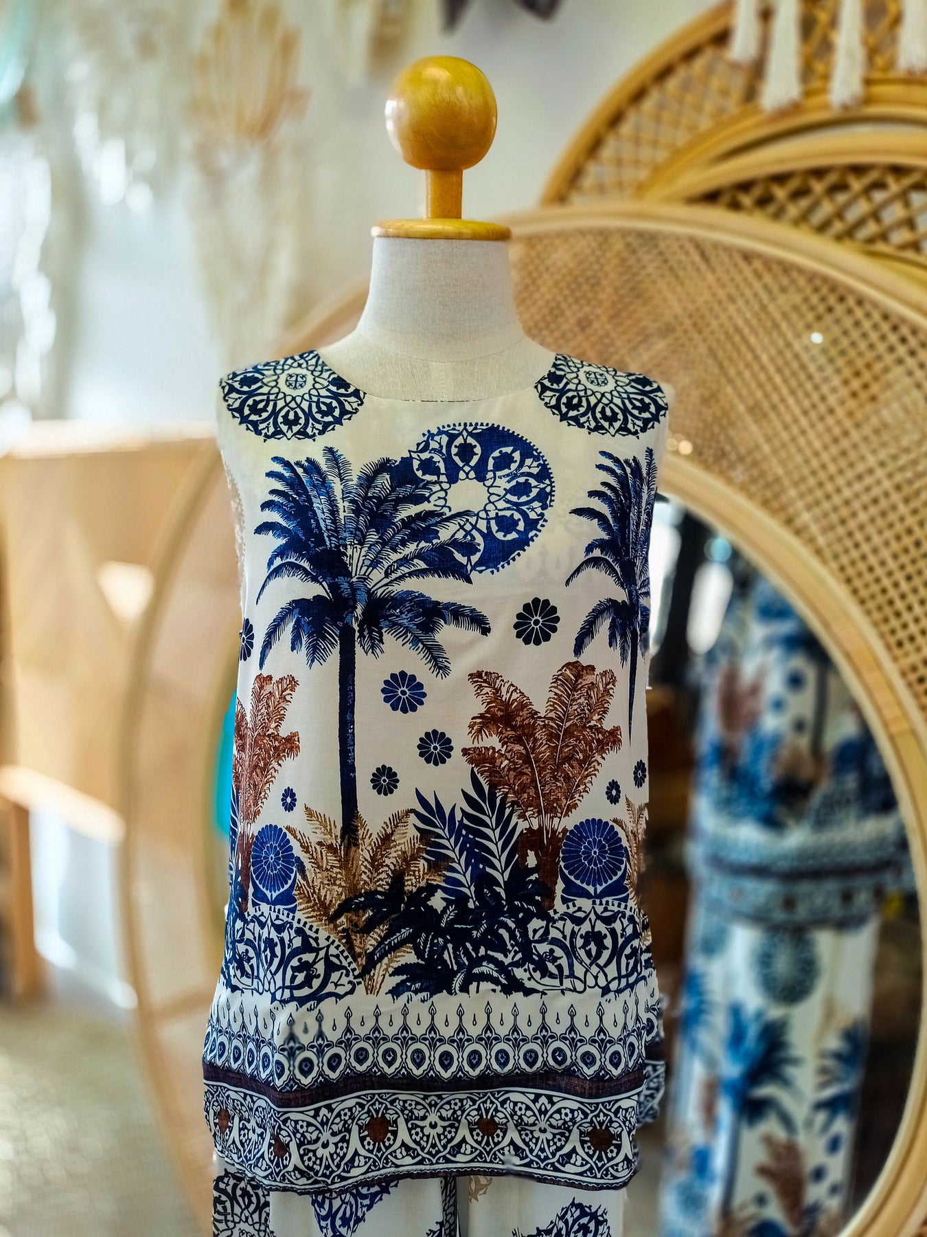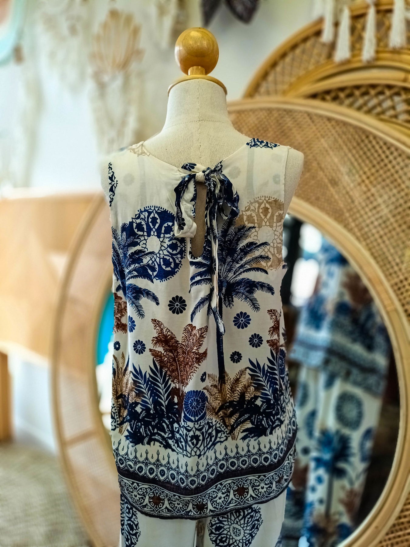 This Palm Top is the perfect mix of gorgeous and fun. With a palm-themed print and a playful tie on the back, it's a must-have for your wardrobe. Stay stylish and comfortable all day long in this sleeveless top.