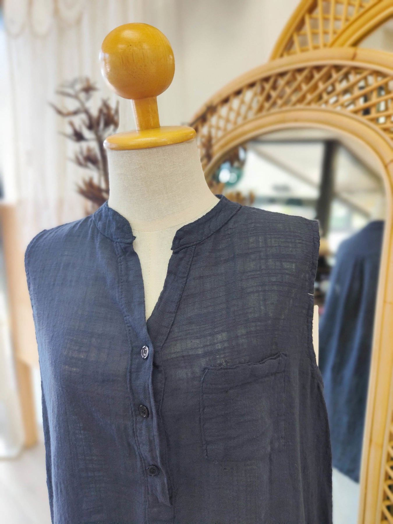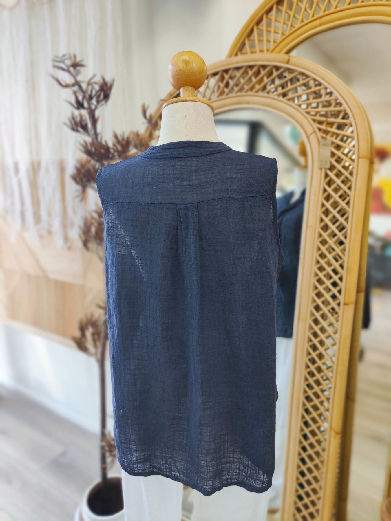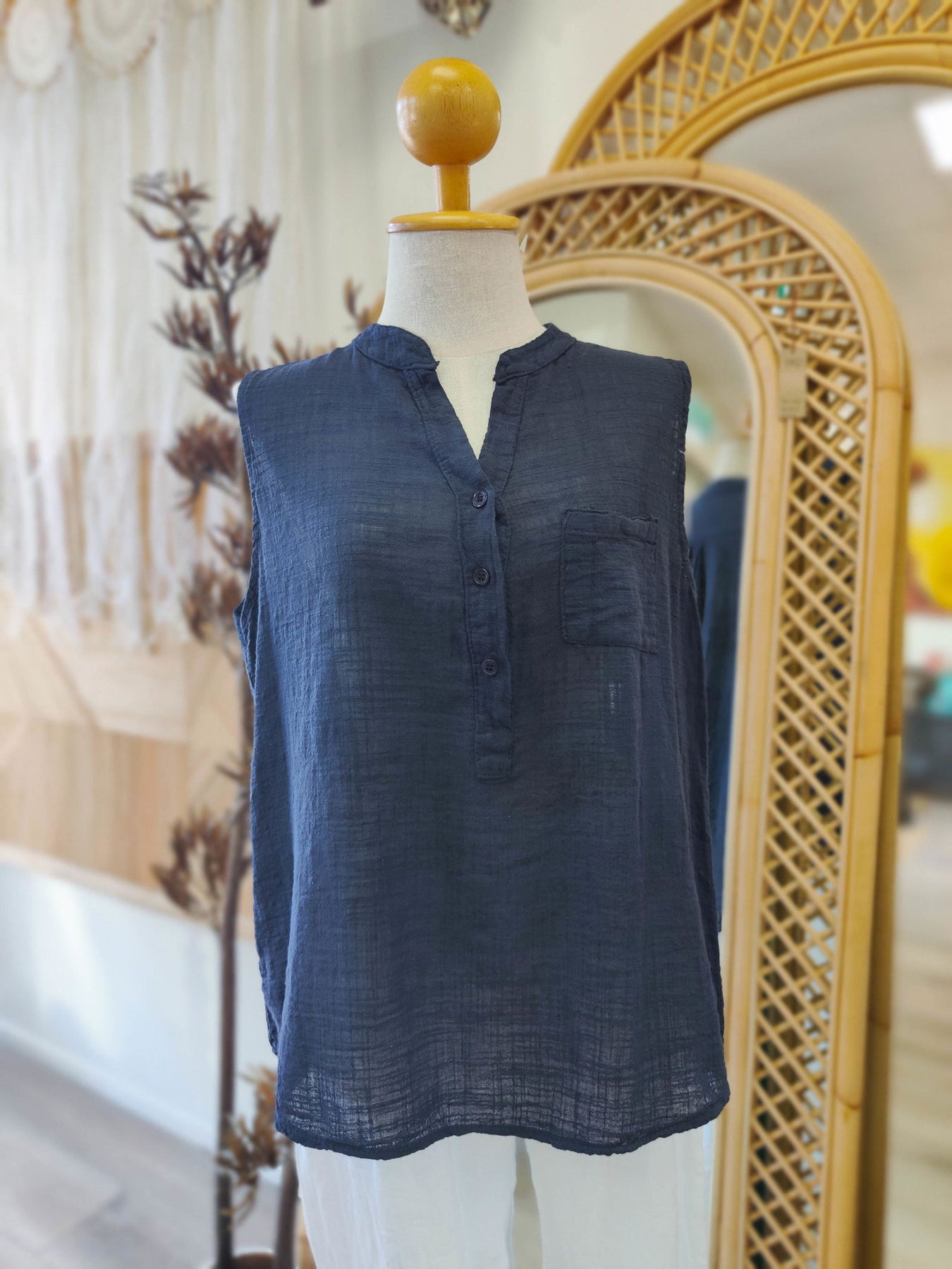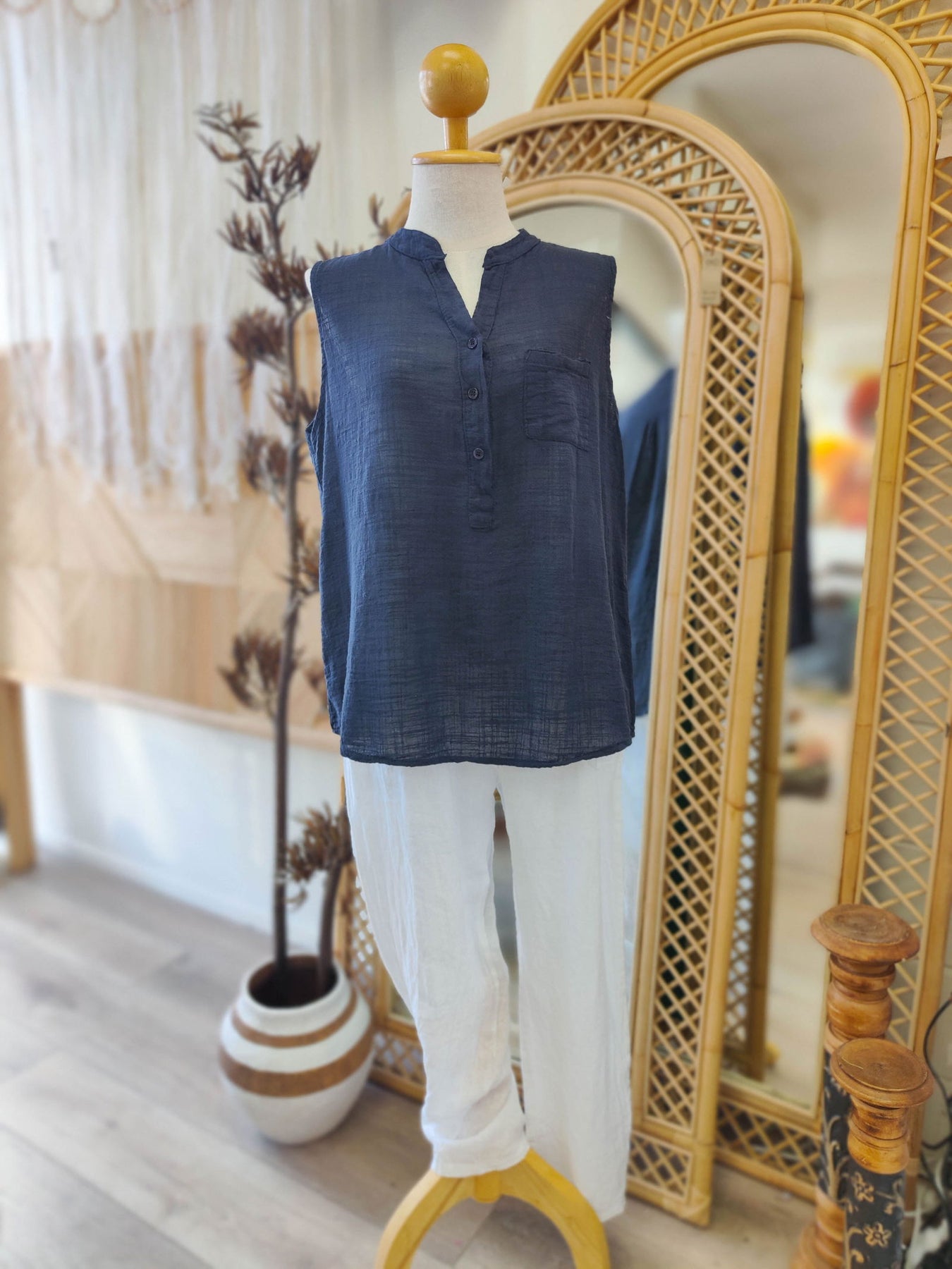 Sip on your fresh lemonade in this gorgeous Hana Singlet. This cotton linen blend with a half button down front is an easy through on singlet perfect for when your too hot to think what to wear.